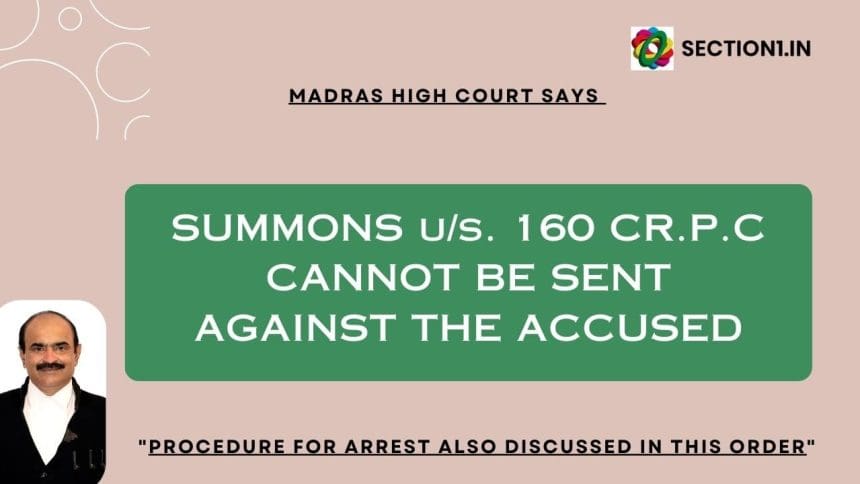 9. On a careful perusal of the above provision, for issuance of summons the same can be issued for attendance of witness who resides within the limit of the police station jurisdiction or any adjoining station. Further on a perusal of the Section makes it very clear that the issuance of the summons under Section 160 Cr.P.C. applies only to the cases of persons who appears to be acquainted with the facts and circumstances of the case, who are only witness or possible witnesses. Once the FIR has been registered as against the accused, summons cannot be issued against the accused under Section 160 Cr.P.C. for requiring his attendance for an accused person with a view to answering the charge made against him, as held by the Apex Court in State vs NMT Joy Immaculate reported in AIR 2004 SC 2282. This Court also in V.N. Pachaimuthu’s case (supra) has held that Notice under Section 160 Cr.P.C. can be issued only to witness in any pending FIR but not to a person who is an accused. Therefore, for invoking the provision under section 160 Cr.P.C. for summoning the accused is not permissible to answer the charge. Further, even against any witnesses, the summons could be issued only within the jurisdiction of the police station or any adjoining police station. Beyond that such summons is not permissible as per the Section 160 Cr.P.C. Whereas in the case on hand, the police has not made any reference as to whether the summons issued is under Section 160 Cr.P.C. Whereas it is only a notice without reference to the provision of law. In a Crl.O.P this Court is accepting the view of the V.N. Pachaimuthu’s case (supra) and quashed the summons with a liberty to the police to proceed further with the case and deal with the complaint in accordance with the guidelines given by the Honourable Apex Court in Lalitha Kumari Vs. Government of Uttar Pradesh [2013 (6) CTC 353].
